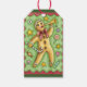 Einfach zu personalisieren Weihnachtsgeschenktafeln, um eine individuelle Nachricht zu erstellen. Vintage Illustration Frohe Weihnachts-Dessert-Urlaubsszenario mit einem bezaubernden Lebkuchenmann, der einen Zuckerrohr hält, umgeben von Sternen und Lollypops. Er macht Musik, indem er ein Horn bläst.