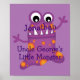 Hier ist ein niedliches, lila Blob-Monster mit großen Augen, scharfen Zähnen und orangefarbenen Flecken, alles auf einem Lavendelhintergrund. Es ist voller Spaß und will, Dein kleines Monster zu sein. Ob Mama, Vater, Tante, Onkel, Gran oder Madison der Babysitter, Sie können den Namen und Ihren des Kleinkindes hinzufügen, und sie werden ein ganz einzigartiges Kinderposter haben, das ganz und gar ihr eigenes Cartoon ist.