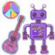 Niedlicher lila Roboter mit einem friedlichen Zeichen und farbenfroher, herzlich gemusterter Gitarre, was für ein Spaß!