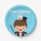 Partyversorgungen, zum Ihres magischen Showgeburtstags-Party auszuspielen und zu verzieren! Er hat einen niedlichen kleinen Jungen in einer Magierausstattung schwarzer tailcoat Jacke und der roten Bogen-Krawatte mit einem magischen Wand in seiner Hand. Er hat ein kleines weißes Häschen auf seinem Haar nahe bei dem magischen Hut. Groß für Partys, in denen Sie Magier einstellen, oder wenn der Geburtstagsjunge magische Tricks durchführen mag. Personifizieren Sie leicht mit Ihrer Partymitteilung. Hintergrundfarbe kann geändert werden.
