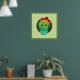 Ein Poster mit einer niedlichen Abbildung eines grünen Kakteen, das in einer Blume sitzt. Große kawaii Augen und ein rotes Sombrero tragen. Der Hintergrund ist ein Muster mit kalkgrünen Wirbel.