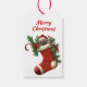 Auf der Vorderseite dieses Holiday Geschenketiketts ist ein Bild eines bezaubernden Mops Welpen, der aus einem verzierten roten Strumpf guckt. Das Bild ist umgeben von heiligen, roten Beeren und Poinsettia Blüten. Im Text oben steht "Frohe Weihnachten". Auf der Rückseite des Tags befindet sich ein anderes Bild eines heiligen Rechtschreibens, dessen Textfelder rot sind, damit Sie sie anpassen können.