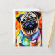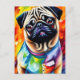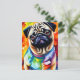 Niedlicher Mops Hund in einer farbenfrohen Jacke Postkarte