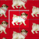 Niedlicher, wilder Mops Hund mit einem roten Bugkragen und seiner Nase in der Luft. Spaß wiederholen gemusterten Mops Hund auf einem roten Hintergrund. Original Aquarellmalerei und Design von Sarah Trett für www,mylittleeden.com