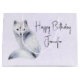 Eine Geburtstagsgeschenktüte mit einem Aquarellbild eines weißen Fuchses mit extravagant blauen Flora-Designs über seinem Fell.