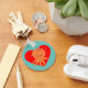 Ein niedlich orangefarbener Oktopus auf einem roten Cartoon. Blauer Hintergrund. Schlüsselketten für Kleintiere. Geschenkidee für Kinder.