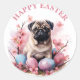 " Happy Oaster " Aufkleber mit einem Aquarell-Mops mit Blume und Osterschokoladeneiern. Personalisierbar.