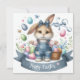 Dies ist eine charmante Osterillustrierung mit einem spielerischen Hasen mit Denim Overalls und einem gestreiften Shirt, das mit einem großen blauen Bogen auf seinem Kopf versehen ist. Der Hase steht mit seinen Armen weit in einer fröhlichen Pose verteilt. Umgeben sind es farbenfrohe Ostereier, Blume und Blätter, schwimmende Bänder und dekorative Akzente. Der Hase hat einen Korbkorb, der mit bunten Ostereiern gefüllt ist. Am unteren Rand zeigt ein dunkelblaues Band-Banner den Text "Happy Oaster" in elegantem Skript an, wobei ein kleines Herz das festliche Ambiente verstärkt.