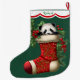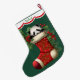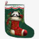 Dieser Holiday Strumpf hat das Bild eines bezaubernden Panda-Babybären, der aus einem verzierten roten Strumpf schaut. Das Bild ist umgeben von heiligen, roten Beeren und Poinsettia blüht, und wird auf einem grünen Weihnachtsuntergrund platziert. Eine weiße, in Rot umrandete Kante hält Ihren individuellen Namen oben. Die Rückseite des Strumpfs ist identisch mit der Vorderseite.