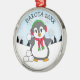 Ein niedlicher, lustiger Cartoon Pinguin, der Schneebälle wirft und personalisierte Weihnachtsschmuck mit Schneeflocken-Hintergrund bewundert.