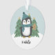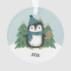 Dieser bezaubernde Weihnachtsschmuck mit einem handgezogenen Pinguin, der einen Hut und Schal in aquamarinem Blau trägt. Er ist vor einigen Weihnachtsbäumen stehend und hält einen Lebkuchengebäck, während er im Hintergrund schneit. Eine Textvorlage mit stylischem Schriftart ist für eine einfache Personalisierung auf der Vorderseite und die Rückseite enthält eine Textvorlage für das Jahr. *Original Illustration von Orabella Prints.