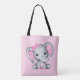 Eine Tasche mit einer niedlichen rosa Elefant Aquarellbild. Sie hat niedliche Pink-Weiß-Polka-Punkteohren und einen hübsch rosa Schleifenbogen auf ihrem Kopf. Der Hintergrund ist hellrosa mit cremefarbenen Polka-Punkten.
