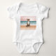 Niedlicher Pitbull Hund sitzend am Strand mit Sonn Baby Strampler