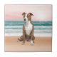 Niedlicher Pitbull Hund sitzend am Strand mit Sonn Fliese
