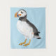 Eine gemalte Abbildung eines Puffins. Dieser niedliche Vogel wird im Stil einer Kinderbuch-Abbildung gezeichnet. Sie hat Stiche und Fäden auf ihren Federn. Ein Design für alle, die Puffins Lieben.