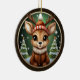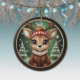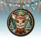 Dieser Rentierschmuck ist mit einem runden, rustikalen Braun- und Goldrahmen versehen, der ihm einen eleganten Look verleiht. Im Inneren des Ornaments entfaltet sich eine Weihnachtsszene mit einem süße Tier, Hirsch mit Anbetern in einem Cartoon-grafischen Stil, mit einem braunen Mantel mit Pelz um den Kragen, brauner Hut mit weiß und rot gestreiftem Schnitt, im Vordergrund stehend. Im Hintergrund finden Sie weiche, winterliche Elemente wie Weihnachtsbäume, Schneeflocken und eine weitläufige Winterschneelandschaft, die den Charme dieser wunderschönen, einzigartigen Dekoration vervollständigt. Das gleiche Bild ist vorne und hinten. So wird sichergestellt, dass der Schmuck, egal wie er sich dreht, immer festlich und vollständig aussieht.