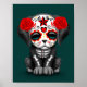 Dieses niedliche Design ist mit einem kleinen schwarzen Welpen dekoriert, der mit den "Day of the Dead"-Mustern geschmückt ist. Rote Rosen tauchen in den Hunden auf, während ein Fünf-Punkte-Stern mitten in der Stirn sitzt. Das schwarze Welpengesicht ist weiß gestrichen und mit Wirbel und Punktmustern in der Tradition des Tages der Toten Zuckerschädel dekoriert. Weiße Knochen und ein Rippenkäfig erscheinen auf dem Körper des Hundes, was ihm einen Skelettlook verleiht. Der übergroße Kopf und der kleine Körper zusammen mit den Details im Fell schaffen eine schöne Kombination aus Cartoon und realistischem Look. Dieser einzigartige und bezaubernde Welpe ist ein bezaubernder Tag des Toten Designs.