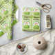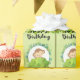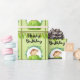Papier mit einem hübschen sich wiederholenden Muster. Ein Cartoon, das ein kleiner Affe zeigt, der hinter einem grünen Busch in einem Olivenbaum herauguckt. Umgeben von einem Kranz tropischer Blätter. Ein Banner mit tropischen Blätter erstreckt sich auch über die Spitze jedes Platzes. Herzlichen Glückwunsch zum Geburtstag in einem trendigen Schriftart. Set auf einem olivgrünem Aquarell.
