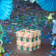 niedlicher Santa mit Geschenken und Spielzeug in S Geschenkschachtel