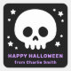 Square Happy Halloween Aufkleber mit einem niedlichen, weißen Schädel mit Sternen. Unterhalb des Schädels befindet sich ein Sondertext in einem fett lila Schriftart "Happy Halloween" und deinem Namen. Schwarzer Hintergrund. Alle Farben sind anpassbar.