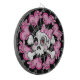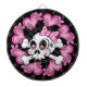 Niedlicher Schädel und Kreuzknochen mit Polka gepunktetem Bogen, umgeben von rosa Herzen und Blume.