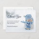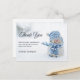 Vielen Dank Postkarte mit einem niedlichen Foto mit einem kleinen Schneemann. Stehend im Winter mit Schneefall. Dieser niedliche kleine Typ ist in blau gestrickter Outdoor-Kleidung gekleidet. Im Hintergrund ist ein weißer/grauer Bukett sichtbar.
