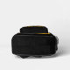 Ein niedliches schwarzes Kätzchen-Rucksack, das sich auf ein Abenteuer freut. Der Hintergrund ist ein ockerfarbenes gemustertes Design mit schwarzem Imitat-Leder.