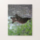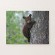 Foto eines niedlichen schwarzen Bärenkubs, der im Wald auf einen Baum klettert.