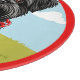 Adorable Cartoon-Darstellung eines schwarzen Hundes mit einem roten Kettenkragen vor sonniger Kulisse, die Fröhlichkeit und Verspieltheit ausdrückt.