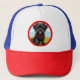 Niedlicher schwarzer Hund mit rotem Kollar im Cart Truckerkappe