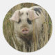 Dieses niedliche Set runder Aufkleber zeichnet sich durch ein wunderschönes Foto eines niedlichen rosa, spottigen Schweins aus einem großen Gras aus.