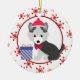 An der Vorderseite dieses Holiday-Ornament ist ein niedlicher, grauer sibirischer Husky-Welpe mit einer Kappe und Bogen-Krawatte. Neben ihm ist ein blau gestreiftes Weihnachtsgeschenk. Die Bilder werden auf einem weißen ovalen gerahmt durch ein Retro-rotes Schneeflockenmuster platziert. Die Rückseite des Ornaments hat den gleichen Hintergrund und oval mit Ihrem benutzerdefinierten Text in zwei Feldern. Niedlich! *Dank dem Geschenksaisonshop für das Hundebild in diesem Design.