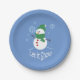 Diese Papierplatte kennzeichnet ein niedliches Cartoon Snowmanbild. Der Schneemann wird oben in einem grünen Schal eingewickelt und einen zusammenpassenden hellgrünen Hut trägt. Es gibt die verschiedenen -groß Schneeflocken, die rund um ihn fallen. Weißer Text am unteren sagt ließ es schneien! Das Bild und der Text werden auf einen blauen Hintergrund gesetzt. Festlich und Spaß während der Ferienzeit oder während des Winters.