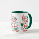 Hier ist eine niedliche Holiday-Kaffee-Tasse, die erklärt "Es ist alles FUN und GAMES bis SANTA Karo die NAUGHTY LIST". Die vorherrschenden Farben sind rot, grün, blau und schwarz. Bild und Text werden dreimal um die Tasse wiederholt.