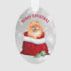 Ein zauberhafter kleiner Spitz Pop aus einem roten Geschenksack vor diesem Weihnachtsschmuck. Ein paar aquamarine und goldene Muster Holiday Baum Glühbirnen liegen direkt vor der Santa Tasche.Der Text über dem Bild sagt "MERRY CHRISTMAS" in rot. Das Bild und der Text werden auf einem silbernen abstrakten Hintergrund platziert. Die Rückseite des Ornaments hat das gleiche Bild, aber mit dem Text "HAPPY NEW YEAR" in aquamarinem Grün.