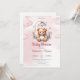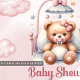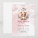 Wunderschönes Design für Mädchen Dusche Einladungen bietet Niedliche Watercolor rosa Teddy Bär in Krippe mit Schnuller. Moderne kidisch-Script-Typografie. Zögern Sie nicht, mich zu kontaktieren, um passende Artikel oder Anpassungen zu erhalten. Violetdrucke ©