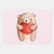 Papierbögen mit einer niedlichen Aquarellbilder. Ein brauner Teddybär, der ein großes rotes Herz trägt. Rosa Hintergrund mit weißen Polka Punkten.