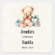 Candle-, Seife-, Krebs- oder Küchenproduktkleber mit einer niedlichen Abbildung eines Viktorianischen Teddybären. Tragen eines extravaganten roten Bogens. Gezeichnet in einem niedlichen altmodischen Vintagen Stil. Rote und blaue Pastellgeschenke umgeben diesen herzhaften Bären.