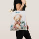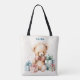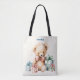 Tote Tasche mit einer niedlichen Abbildung mit einem Viktorianischen Teddybär. Tragen eines extravaganten roten Bogens. Gezeichnet in einem niedlichen altmodischen Vintagen Stil. Rote und blaue Pastellgeschenke umgeben diesen herzhaften Bären.
