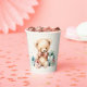 Papiertassen mit einer niedlichen Abbildung mit einem Viktorianischen Teddybär. Tragen eines extravaganten roten Bogens. Gezeichnet in einem niedlichen altmodischen Vintagen Stil. Rote und blaue Pastellgeschenke umgeben diesen herzhaften Bären.