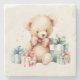 Ein Untersetzer aus Stein mit einer niedlichen Abbildung mit einem Viktorianischen Teddybär. Tragen eines extravaganten roten Bogens. Gezeichnet in einem niedlichen altmodischen Vintagen Stil. Rote und blaue Pastellgeschenke umgeben diesen herzhaften Bären.