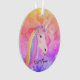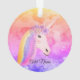 Niedliche Unicorn-Regenbogen-bunte Wolken-personalisierte Verzierung macht eine große Geschenkidee für ein Kind, das Lieben Unicorns. Hintergrund entworfen mit Regenbogenfarben und ein niedlicher weißer Unicorn angeredet mit dem Regenbogenhaar, den Blumen auf ihrem Kopf und Namen im Skript.