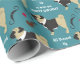 Ein hübscher Schwarz-Weiß-Mops trägt eine Tuxedo-Jacke auf diesem niedliche Geburtstag-Packpapier. Neben ihm sind Bilder eines Schnurrbarts, einer Brille, einer Pfeife und eines roten Herzens. Der weiße Text sagt "Alles gekleidet, um Ihnen einen guten Geburtstag zu wünschen". Die Bilder und der Text werden auf einem aquamarinen grünen Hintergrund platziert.
