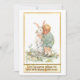 Charmante und nostalgische antike Osterkartenillustrierung mit einem hübschen kleinen Jungen, der einen weißen Ostersonnigen umringt von Gras, Blume und Eiern mit süßem Vers umarmt. Die Rückseite bietet ergänzende Grafiken.