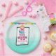 Ein Set aus personalisierten Tellern mit einem niedlichen Aquarellbär, der eine goldene Krone trägt. Dieses skurrile Tier ist in Rosa und Grün gestrichen und mit Herzen über seiner Brust dekoriert. Ein farbenfroher Banner, der sich über die Oberseite erstreckt. Hintergrund ist ein aqua grün ombre Farbverlauf.
