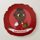 Rundkissen mit einer Illustration eines niedlich lächelnden, glücklichen, schwarzen Mädchens oder eines kleinen Kindes trägt das Kind rote und weiße Kleidung und hält ein Geschenk; mit bearbeitbarem Textbogen für Ihren Namen oder Ihre Nachricht, Weihnachtsfeiertagsgestaltung mit rotem Hintergrund