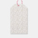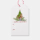 Ein Weihnachtsgeschenk-Tag zeigt einen niedlichen Gnome stehend auf einem Kiefernnadelbett vor seiner gemütlichen Zuhause. Ein glatter goldener Stern ist auf seinem Baum. Unten in festlich roter Retro-Kalligrafie ist "Frohe Weihnachten" und unten ist "nach" und "von" Text vorgedruckt. Das Gegenteil ist ein Muster winziger goldener Sterne. (Die glitzernden Golddetails sind nur digitaler Druck).