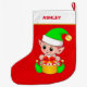 Moderne niedliche Weihnachtself mit Geschenkboxen auf rotem Hintergrund Weihnachten Strumpf. Roter und weißer Strumpf.