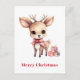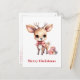 Weihnachtspostkarte mit Illustration eines bezaubernden Hirsches. Große Augen große Ohren mit einem großen Kopf und kleine braune Geweihe. Tragen Sie einen großen roten Bogen.