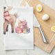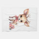 Ein Küchentuch mit einer Illustration eines bezaubernden Hirsches. Große Augen große Ohren mit einem großen Kopf und kleine braune Geweihe. Tragen Sie einen großen roten Bogen. Stehend neben einem Stapel Geschenke.